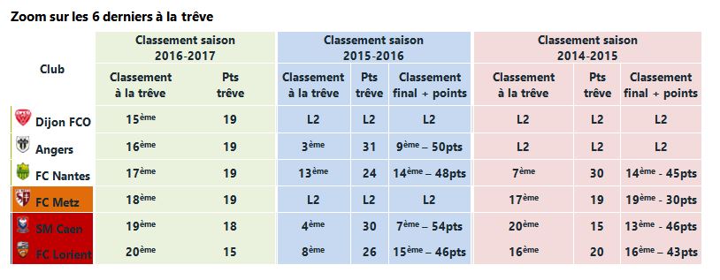 Les vikings qui comptent 1 point de retard avec 1 match en moins, ont connu le même cas il y a deux ans. 20èmes à la trêve, ils avaient terminé 13èmes avec de mémoire, un nul arraché (2-2) arraché au Parc des princes et une victoire contre Lyon a domicile. Caen recevra Lyon le 15 janvier pour sa reprise.