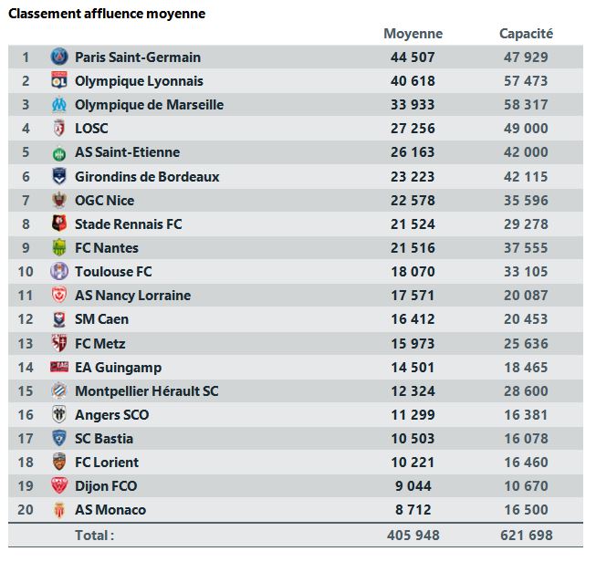 Mention spéciale à Guingamp qui, avec une population de 7100 habitants, arrive à générer 14501 spectateurs de moyenne dans un stade de 18000 places.