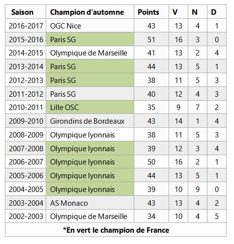 Champion d’Automne ne veut pas nécessairement dire champion, seulement 8 équipes sur 14 ont terminé en tête après avoir fini 1er à la trêve. On se rappelle -entre autres- la saison 2011-2012 qui a vu la bande à Giroud et Bédimo arracher le titre des mains d’un Ancelotti qui venait fraîchement de remplacer un « casque d’or » (Décidément il est vraiment partout) premier à la trêve.