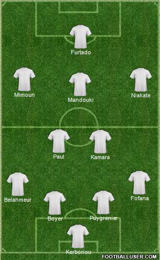 Lejeune, Kerboriou (2e gardien), Furtado, Puygrenier, Boyer, Fofana, Paul, Mandouki, Zéoula, Mimoun, Kamara, Niakaté, Di Bartoloméo, Loriot, Sainte-Luce, Belahmeur ; absents : Buaillon (cuisse), Mbow (genou).
