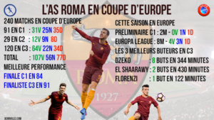 Pour un club presque centenaire, la Roma compte relativement peu de matchs en Europe surtout en C1. Le club qui n’a pas était souvent champion et seulement 11 fois vice champion, a disputé moins de 100 matchs en Ligue des Champions. A titre de comparaison avec son adversaire de jeudi, l’OL, en près de 70 ans compte 131 matchs en C1. Mais les italiens comptent quand même 13 matchs européens de plus et surtout deux finales de Coupe d’Europe.
