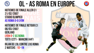 Les deux équipes s’étaient déjà rencontrées en huitièmes de finale, mais lors de la Ligue des Champions 2007. L’OL était favoris pour passer ce tour, mais après un nul à Rome, Totti et Mancini viendront mettre prématurément un terme à l’aventure des gones en Europe .