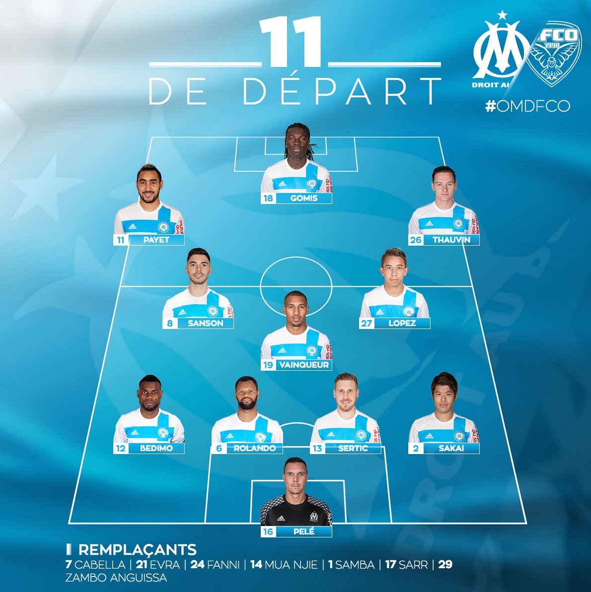 -35' Le 11 du #DFCO : Reynet – Rüfli, Varrault (cap), Lotiès, Haddadi – Belmonte, Abeid, Amalfitano, Kwon, Lees-Melou – Tavares #OMDFCO