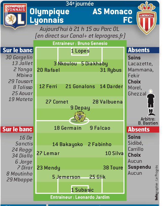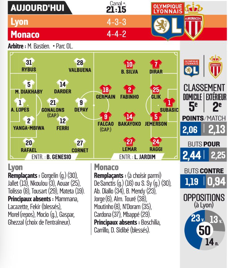 Ce soir, les deux héros d’Europe français, épuisés après une très longue semaine européenne, s’affrontent à nouveau au Parc OL. Les monégasques ont une, voire deux revanches à prendre : la claque reçue dans ce stade en mai dernier (6-1), puis la vengeance ratée au Stade Louis II en décembre 2016 (1-3). Mais aujourd’hui, tous les observateurs s’accordent à dire que cet OL n’a pas les armes pour réitérer l’exploit. Privé de son buteur maison Alexandre Lacazette (blessé jeudi à Istanbul), de son meneur de jeu Nabil Fékir (souffrant de la cheville), ainsi que d’un nombre de ses cadres toujours épuisés après l’interminable match contre le Beşiktaş, le groupe de Bruno Genesio semble assez faiblement armé pour tenir devant l’armada offensive monégasque. Mais le football n’est qu’une succession d’histoires improbables, d’où tout son charme. Découvrons ensemble les détails du choc de la soirée.