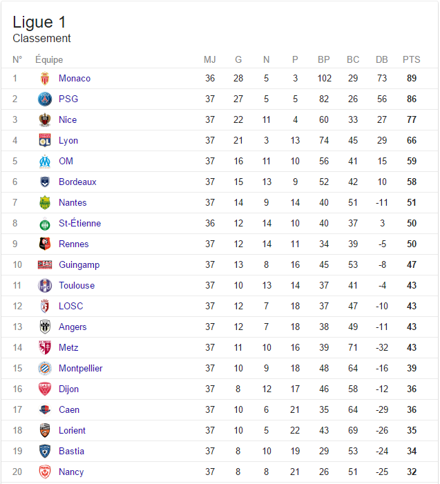 Tout en haut du classement, la course effrénée au titre en l’AS Monaco et le Paris Saint-Germain est presque pliée. Malgré la victoire des hommes d’Unai Emery sur le score fleuve de 0-5 au Stade Geoffroy Guichard contre l’ASSE, les monégasques restent devant au classement. Après leur large victoire contre le Lille OSC (4-0), les hommes de Léonardo Jardim comptent en effet 89 points, contre 86 points « seulement » pour les parisiens. Sans oublier le match en retard du club de la principauté, à disputer mercredi contre .. l’ASSE. En cas de victoire, l’ASM sera mathématiquement sacré champion de France 2016-2017.