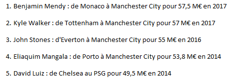 Depuis plusieurs saisons, et ce bien avant l’arrivée de Guardiola sur le banc, Manchester City peine à trouver de la stabilité en défense et dépense des sommes colossales sur des arrières. La preuve avec le classement des défenseurs les plus chers de l’histoire. Les quatre premiers ont été acheté par les pensionnaires de l’Etihad Stadium. Sans oublier d’autres éléments recrutés pour de grosses sommes et encore présents dans l’effectif comme Otamendi (44,6 M€) ou Kompany (8,5 M€).
