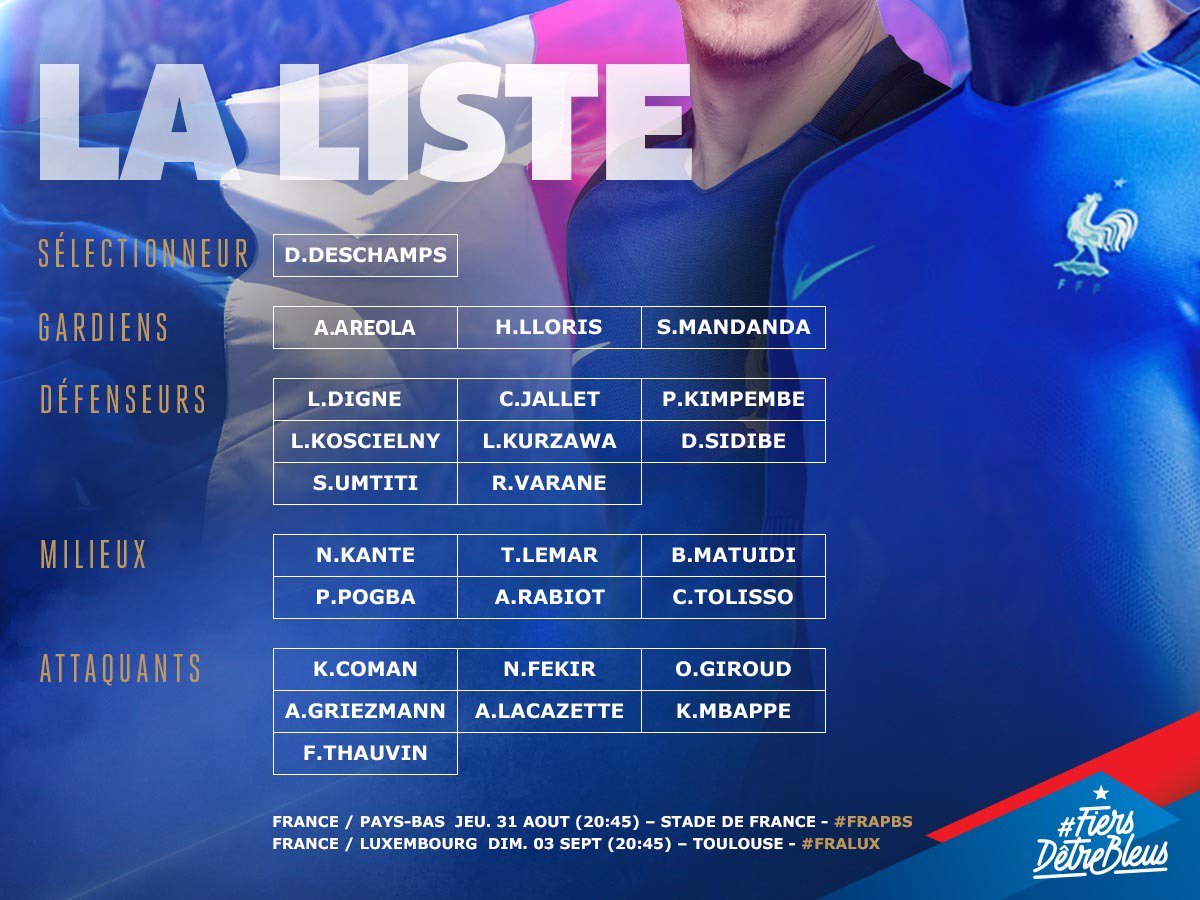 Pour affronter les Pays-Bas et le Luxembourg lors des rencontres décisives comptant pour les qualifications à la Coupe du Monde 2018 en Russie, Didier Deschamps a composé un groupe de 24 joueurs.