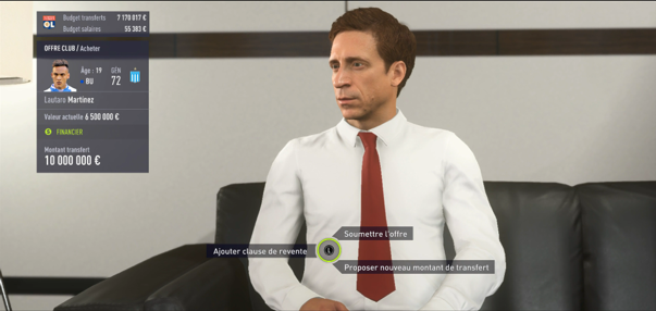 Le deuxième point qui a subi un changement est la gestion des transferts, avec le point de menu accueil transfert. Depuis cette fonctionnalité, on peut voir la liste de nos cibles au mercato ainsi que l’historique de nos offres. Enfin on peut voir nos joueurs à la recherche d’offres. De plus, de nouvelles cinématiques pour les transferts apparaissent.