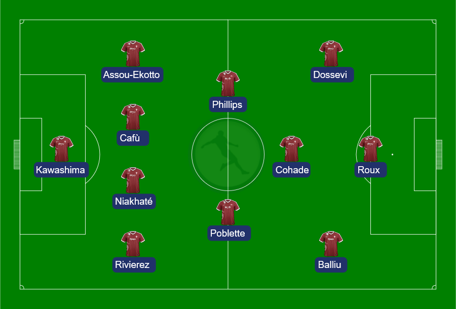 Milieux : Cafu, Thill, Poblete, Nguette, Philipps, Cohade, Mollet, Dossevi