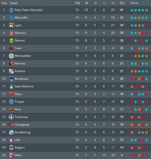 Le champion de France en titre l’AS Monaco recevait le Paris Saint-Germain lors de la quatorzième journée. Un choc très attendu qui sera finalement très déséquilibré. En effet, l’ASM n’est plus l’équipe de la saison précédente et se fait dominer par Paris. Après des buts de Cavani et Neymar, les parisiens rateront beaucoup d’occasions, ce qui laissera le club du Rocher dans le match, surtout lorsque Moutinho réduit la marque sur coup franc. Mais l’écart est trop grand entre les deux formations et le club de la capitale s’impose logiquement (1-2).