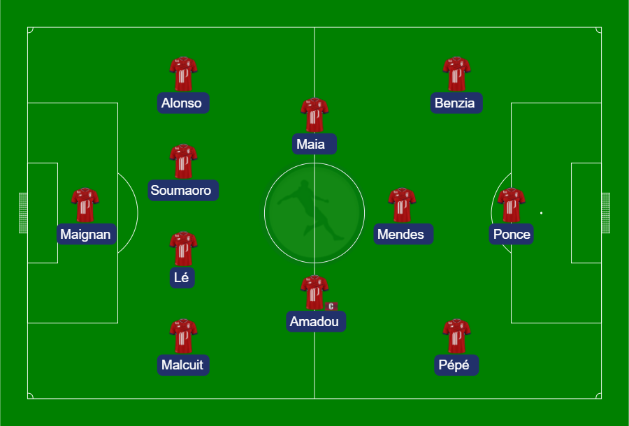 Milieux : Amadou, Thiago Maia, Thiago Mendes, Bissouma, Benzia, Bahlouli, Soumaré