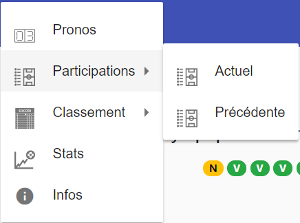 Vous pouvez bien sûr revoir votre pronostic ou celui de la précédente journée. Pour cela, rien de plus simple il suffit de cliquer sur le menu en haut à gauche (les trois points verticaux) puis aller sur « Participations » et enfin cliquez sur « Actuel » ou « Précédente ».