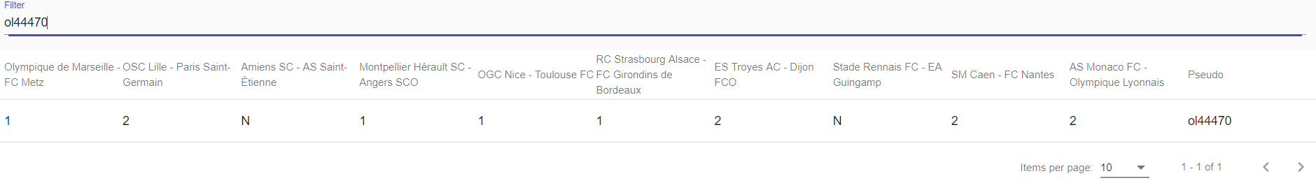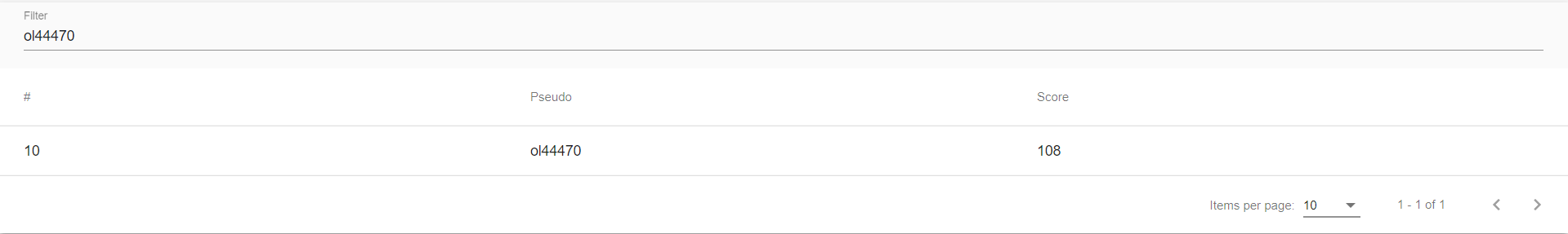 Une fois arrivé sur la page, un tableau avec toutes les participations s’affichent. Pour un plus grand confort, il est possible de filtrer le contenu du tableau en écrivant dans le champ de saisie au-dessus du tableau (par exemple son pseudo).