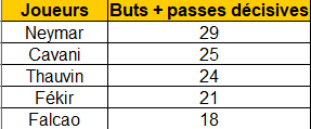 En Ligue 1, Thauvin est le cinquième meilleur buteur de Ligue 1. Mais aussi le deuxième meilleur passeur, à une unité près de Neymar. Cela fait de lui le troisième joueur le plus décisif de Ligue 1, derrière Cavani et Neymar, il est le joueur Français le plus décisif de Ligue 1. Regardez ce tableau.