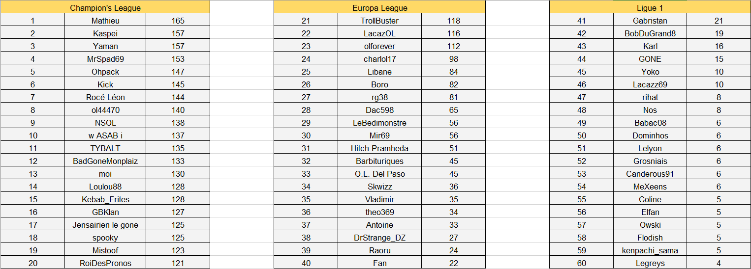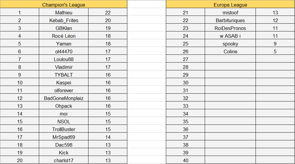 Pour cette journée, le match de Paris est offert et les résultats décalés de 3 soirs après le match de Monaco.
