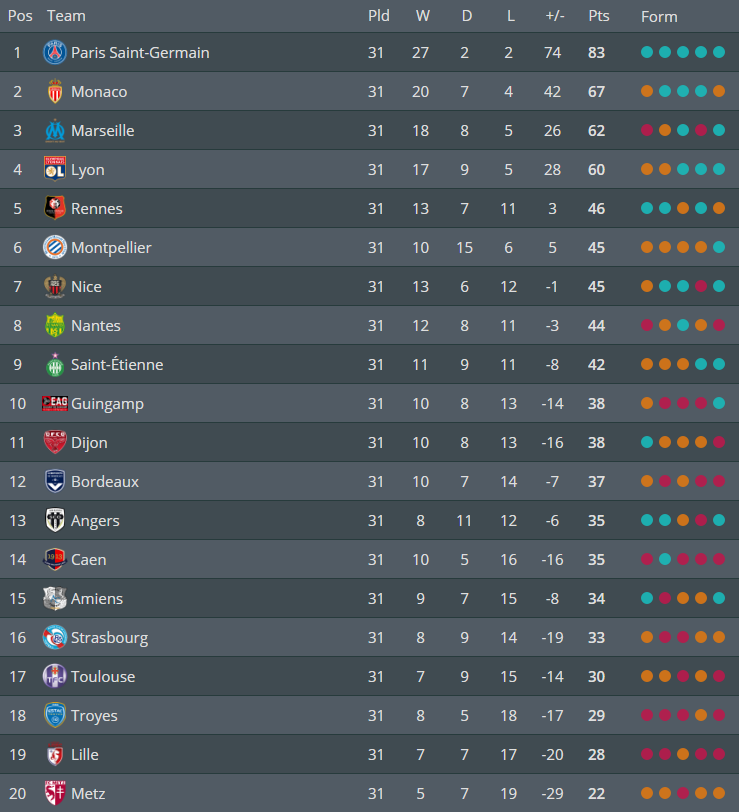 Eliminé de l’Europa League et décevant en championnat en février, l’OGC Nice a relevé la tête en mars. L’on a même parfois retrouvé le jeu léché des niçois ayant fait leur force l’an dernier et qu’affectionne particulièrement Lucien Favre. Les Aiglons peuvent à nouveau compter sur le retour en forme de Wylan Cyprien, essentiel dans le coeur du jeu, mais surtout de la grande forme d’Alassane Plea, auteur de six de ses douze réalisations en deux rencontres. Solides, les hommes de Favre se sont imposés ce mois-ci face à Lille (2-1), ont corrigé Guingamp (2-5) et Troyes (0-2). Le seul accroc réside dans la défaite à domicile face au PSG (1-2) malgré une rencontre aboutie suivie en mondovision à un horaire destiné au marché asiatique (13h). Nice, septième, est idéalement positionné pour disputer le sprint final en vue d’une qualification en Europa League.