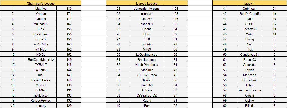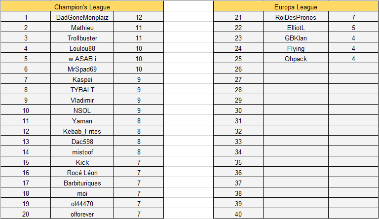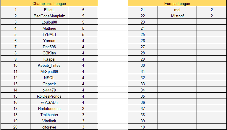 Félicitations à ElliotL, BadGoneMonplaiz, Loulou88, Mathieu et TYBALT qui gagnent le titre de meilleur pronostiqueur de la semaine. Bravo à eux.