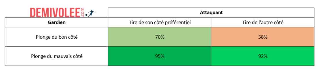 Le taux de réussite est sensiblement plus important si le joueur frappe de son bon côté, et ce quelque soit le choix du gardien. En effet, l’échec est de douze points plus importants si le gardien plonge, et de trois points s’il ne plonge pas. Le joueur cadre en effet moins de son moins bon côté.