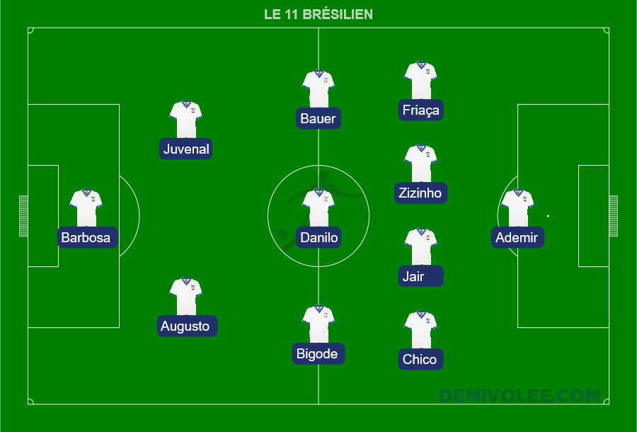 Et la première mi-temps vient confirmer cela. Les deux formations s’opposent dans le schéma en 2-3-5 en vogue à l’époque. Le Brésil peut notamment compter sur Ademir en attaque, qui est meilleur buteur de la compétition avec huit réalisations. Dans la cage, Moacir Barbosa est titulaire. C’est un des premiers gardiens noirs de l’histoire du Brésil, et en plus, il ne porte pas de gants sur les mains. L’arbitre est britannique, il s’agit de monsieur George Reader.