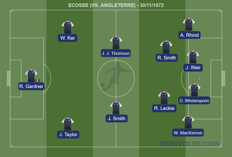 Et pour ce tout premier match de l’histoire du football international, le résultat sera finalement assez décevant. En effet, aucune des deux formations ne parvient à trouver la faille pendant les quatre-vingt-dix minutes. L’Ecosse, sous le maillot du Queen’s Park, bleu foncé – ce qui donnera la couleur du maillot écossais -, est solide est disciplinée. A noter qu’à la mi-temps, Robert Smith, l’attaquant, et Robert Gardner, le gardien, échangent de poste. Du côté anglais, on fait pareil entre John Maynard et Robert Barker. John Maynard, du haut de ses dix-neuf ans, est d’ailleurs le plus jeune joueur de cette double confrontation.