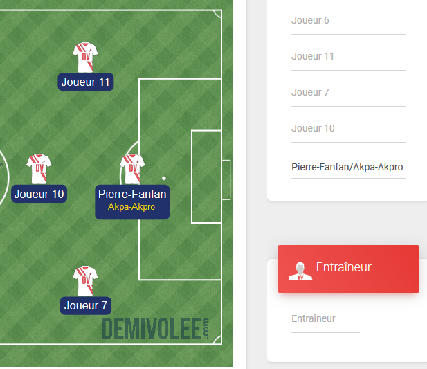 Mais surtout, la grande nouveauté de cette version, plébiscitée par nos milliers d’utilisateurs est la deuxième ligne. Pour l’utiliser, rien de plus simple. Vous tapez le nom de votre joueur de la première ligne, puis vous mettez un « slash » pour faire apparaître une deuxième ligne. Par exemple, voici ce qu’il faut faire si dans votre équipe-type vous voulez aligner José-Karl Pierre-Fanfan avec comme remplaçant Jean-Louis Akpa-Akpro, le frère de Jean-Daniel Akpa-Akpro :