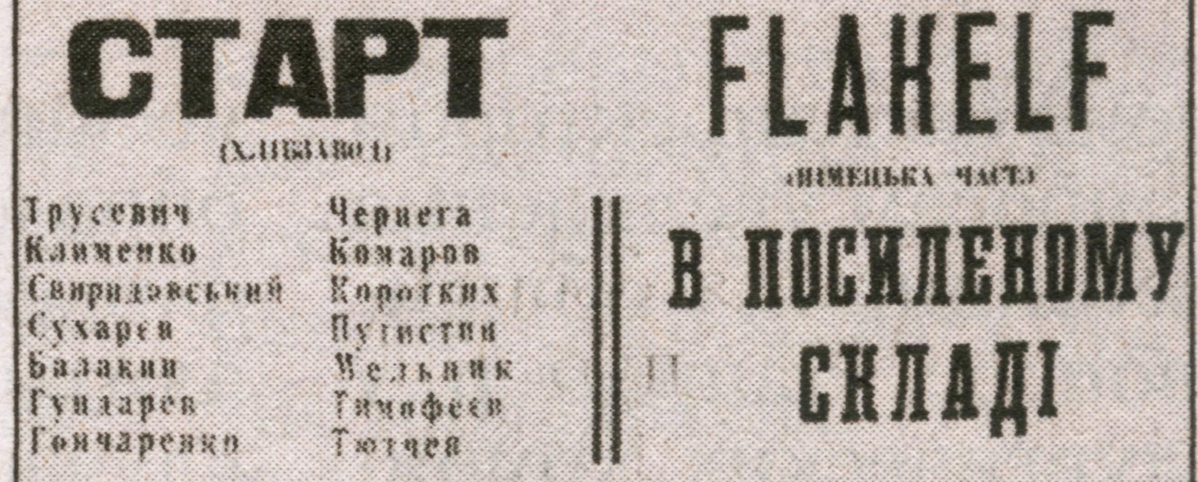 Quasiment tout le monde a payé les cinq Karbovanets pour assister à la rencontre et voir, quelque part, la défaite de l’occupant. La composition des deux équipes est inconnue. On sait juste que quatorze joueurs, donc, étaient présents pour le FC Start. Et qu’au Flakelf, l’équipe était « renforcée » par d’autres joueurs. Ce qui est sûr, c’est que Trusevich était bien titulaire dans la cage de l’équipe de la première boulangerie de la ville.